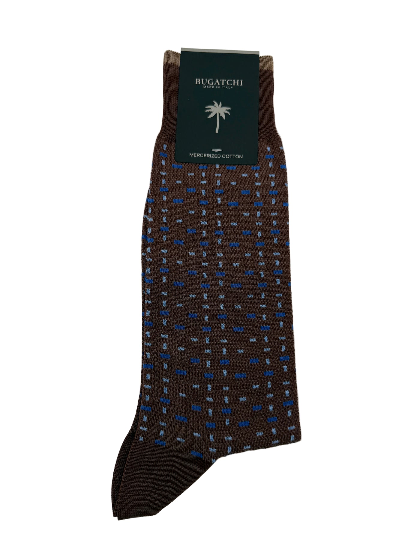 Elevate your sock collection with these Bugatchi mercerized cotton dress socks featuring a sophisticated brown multi-dot pattern. These premium crew-length socks combine Italian design excellence with exceptional comfort.
